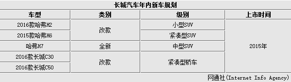 在产品方面,2015年上半年,长城汽车已推出中大型SUV——哈弗H8、紧凑型SUV——哈弗H6Coupe,以及哈弗H6/H2 6AT版;年内预计还将推出2016款哈弗H2、2015款哈弗H6、2016款长城C30、2016款长城C50升级版、哈弗H7等新产品,实现对小型、紧凑型、中型SUV以及紧凑型轿车细分领域的阵容强化。