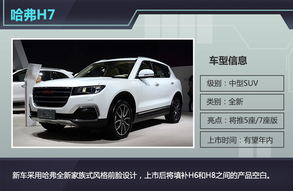 在年内将推出的新车中,全新中型SUV——哈弗H7,无疑是值得关注的亮点。在2015年上海车展期间,哈弗H7已正式亮相,有望于今年四季度正式上市。新车采用哈弗全新家族式风格前脸设计,上市后将填补H6和H8之间的产品空白。