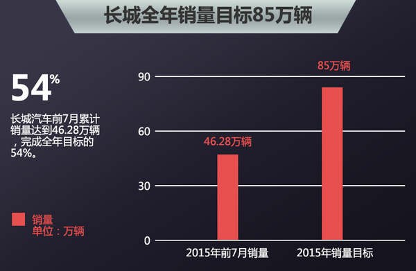 得益于哈弗H6、H2等产品的热销,今年1-7月,长城汽车累计销量达到46.28万辆,同比增长17%。其中,哈弗品牌共销售35.01万辆,占长城汽车总销量的76%份额,并实现同比增长73%,SUV产品对于长城汽车的重要性由此可见一斑。按照年初制定的规划,长城今年将冲击85万辆销量目标,比上年增长61%。