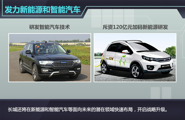 除着眼当下汽车市场外,长城还在新能源和智能汽车等面向未来的领域快速布局,并有所进展。近期长城汽车展示了其在尖端技术方面的研发成果,包括代表未来汽车领域将会涉及到的无人驾驶技术、脑电控汽车等。在新能源方面,长城汽车将非公开发行总数不超过27,643.40万股、总金额不超过人民币120亿元A股,用于研发“新能源汽车”,“新能源智能变速器”、“新能源汽车电机及电机控制器”和“新能源汽车动力电池系统”等核心部件的生产及“智能汽车研发”。