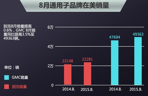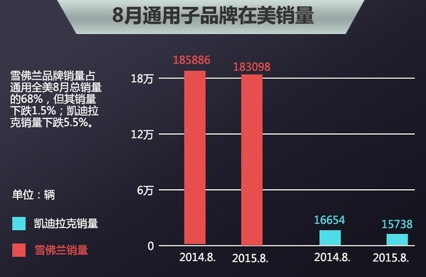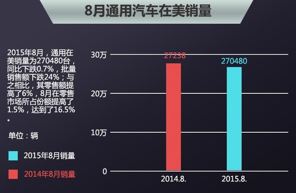 通用今年上半年在华取得了不错的销售成绩,但在美销量却为达到预期水准。2015年8月,通用在美销量为270480台,同比下跌0.7%,批量销售额下跌24%;与之相比,其零售额提高了6%,8月在零售市场所占份额提高了1.5%,达到了16.5%,实现了零售份额连续增长5个月。