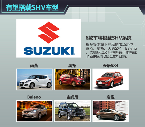 铃木汽车目前在国内销售的车型中,长安铃木奥拓和进口吉姆尼分别搭载1.0L和1.3L自然吸气发动机,天语SX4和启悦都搭载1.6L自然吸气发动机,雨燕则搭载1.3L和1.5L自然吸气发动机。由于全新的混合动力系统在行车过程中减少燃料的消耗,进而提升了燃油经济性,又根据这些车型低于全新小型车的产品定位,未来铃木旗下雨燕等6款车型均有望使用这套混合动力系统,涉及轿车、SUV等不同领域。