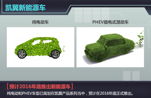凯翼汽车作为奇瑞控股下的一家年轻品牌,目前正在积极推进旗下互联网汽车业务。与此同时,凯翼也没有忽视在新能源汽车领域的发展。日前,凯翼汽车有限公司总经理郑兆瑞与网通社沟通后表示,凯翼汽车目前已在纯电动和PHEV插电式混动车型上有所规划,两种新能源车型预计在2016年底推出。