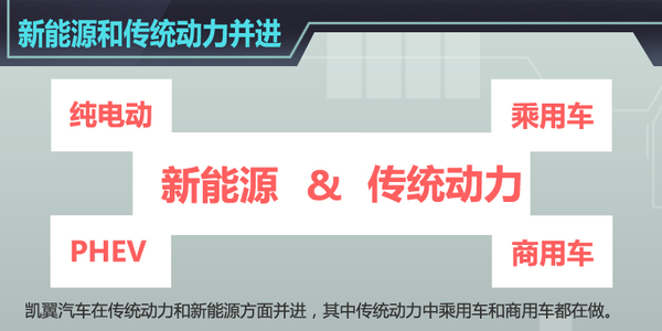 在奇瑞汽车控股下拥有乘用车和商用车两大板块,其中目前凯翼汽车被划分在商用车下,而这样的划分并不影响凯翼研发新产品序列,同时未来也会做出部分调整。目前,凯翼汽车在传统动力和新能源方面并进,其中传统动力中,乘用车和商用车两大板块凯翼汽车也都在做。