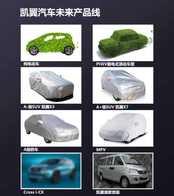 就我们所掌握的资料来看,凯翼汽车在未来3年内会推出7款车型,包括A-级SUV凯翼X3、A+级SUV凯翼X7、MPV车型凯翼V3、众包量产车、凯翼纯电动车、凯翼插电式混动车以及凯翼首款微面。可以看出,凯翼未来的规划在主力市场均有所涉及,而企业也会得到全面发展。