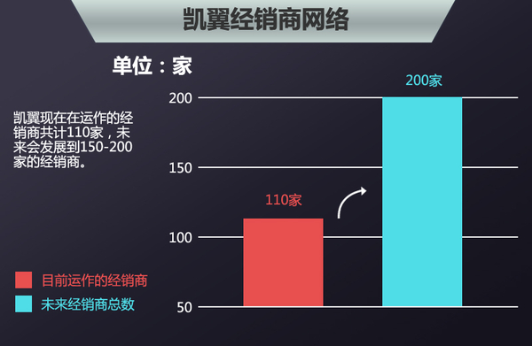 新车投放市场后,离不开经销商网络,而良好的网络布局会助力销量增长。凯翼目前拥有130多家经销商,现在在运作的经销商共计110家,未来凯翼会发展到150-200家的经销商,企业会贯彻一个城市一家经销商的原则。