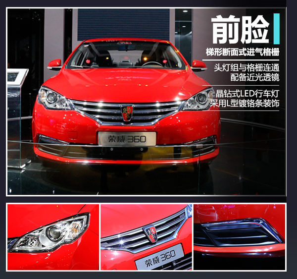 作为一款为80后“新小家庭”打造的高品质A级车,荣威360外观应用最新的“荣威之虹”设计元素,呈现出全新的家族式风格。前脸的倒梯形断面格栅与大灯采用一体化设计,创造出更具识别性的品牌特征。头灯组整体采用不规则造型,内部集成带透镜式光源,实用性及视觉效果均十分出色。下格栅两侧配备“晶钻式”LED日间行车灯,符合当下消费者对于LED光源的偏好。