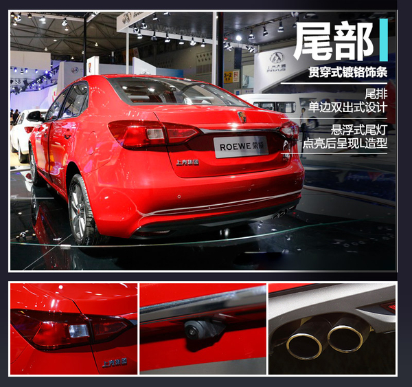 荣威360尾部设计同样亮点丰富,尾箱盖采用横向镀铬饰条装饰,拉伸了横向视觉空间,并增添了豪华感。尾灯组采用悬浮式造型,刹车灯点亮后呈现L造型,极具辨识度。此外新车还配备单边共两出式尾排,从视觉上展示出其动力性能,也进一步提升了整车的档次感。下包围采用与车身不同色设计,增强了视觉上的层次感,两侧配备反光条,可提升夜间行车安全性。