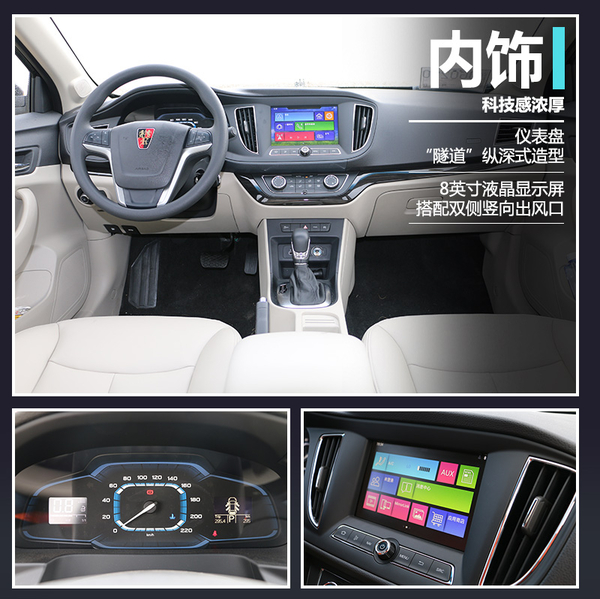 荣威360整体内饰设计呈现简洁大气风格,并极具科技感,以黑色及米色为主色调营造出温馨的内饰氛围。诸多横向线条的设计,扩大了车内的视觉空间感受。新车仪表盘采用典雅蓝色科技背光,隧道式造型凸显其纵深感,其中转速表使用高清数字式显示,时速表使用指针式设计,蓝色背光及白色文字的配合使科技感倍增。