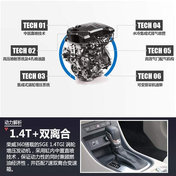 在动力方面,荣威360搭载的1.4TGI中置直喷涡轮增压发动机,最大功率115kW/5600rpm,转速在1600-4000rpm时可爆发出235Nm的最大扭矩,传动系统匹配7速双离合变速箱。新车还采用了Start-Stop发动机智能启停系统,整车综合工况下百公里油耗达到5.7L。此外荣威360还提供搭载1.5L发动机的车型供用户选择,该发动机最大功率80kW,最大扭矩135Nm,同样具备出色的动力性能。