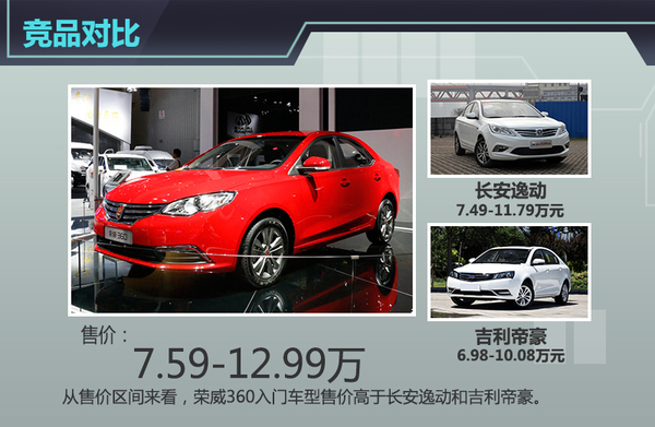 国内A级车市场是容量最大的轿车市场,竞争十分激烈,而合理定价有望使产品在竞争中脱颖而出。与吉利帝豪、长安逸动等同级别竞品对比来看,荣威360 7.59万元的起售价,将高于前两者。考虑到荣威360在外观设计、内饰空间及动力配备方面均展现出不俗实力,具备不错性价比,上市后将成为荣威征战A级车市场的又一员猛将。(网通社2015年9月5日成都报道)
