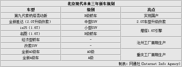 据了解,北京现代2015年下半年继全新途胜之后还将推出4款新车,分别为第九代索纳塔混动版、改款全新胜达2.0T、ix25 1.6T和名图1.6T。这4款车型全部属于北京现代的“D+S”战略车型,包含小型SUV、中型SUV和两款B级轿车(中高级车型),它们将与上半年上市的第九代索纳塔和刚刚上市的全新途胜一道为北京现代完成“D+S”车型销量占比达50%的目标贡献力量,此外北京现代第五工厂(重庆工厂)未来投产的全新A0级车以及A级车将与“D+S”形成补充,为其产品序列添砖加瓦。