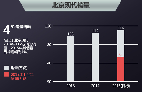 北京现代近年来在华稳步发展,2013年完成了103万辆的销量,同比增长19.76%,比乘用车市场15%左右的平均增速高出5个百分点,市场份额达到7%。2014年,北京现代销售目标为110万辆,实际完成销量112万辆,完成率101.82%,同比增长8.6%。在此背景下,北京现代将今年的销量目标提升至116万辆,同时实现累计产销量达到700万辆的目标。相信随着全新途胜等产品的推出,北京现代的品牌竞争力将进一步提升,销量也将迈上一个新的台阶。(网通社2015年9月5日成都报道)