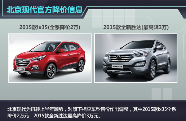 事实上,在产品层面,北京现代在今年3月份推出了旗舰轿车-第九代索纳塔,随后就是9月份上市的全新途胜。从数据上来看,北京现代1-7月份累计销量同比下滑10.09%,主要的原因之一在于瑞纳、朗动、ix35等车型在竞品中的优势已不算明显,加上一直表现强劲的ix25也出现回落,为此北京现代对旗下车型售价进行了调整,今年8月份,2015款ix35和全新胜达进行了官方调价,其中全新胜达最大降幅达到3万元。