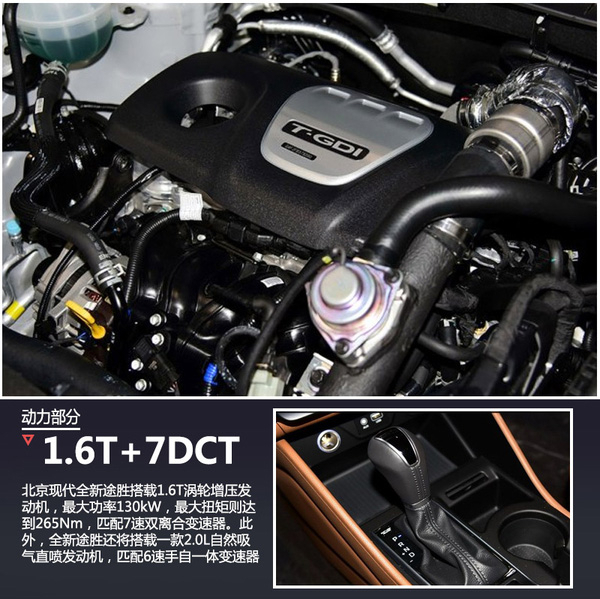 动力方面,北京现代全新途胜搭载1.6T涡轮增压发动机+7速双离合变速器的“黄金动力组合”,新车成为继北京现代旗下第九代索纳塔之后第二款搭载1.6T增压发动机的车型,这款发动机动力输出强劲,最大功率130kW,最大扭矩则达到了265Nm。此外,全新途胜还搭载了一款2.0L缸内直喷自然吸气发动机,匹配6速手自一体变速器。从官方数据看,全新途胜1.6T车型的百公里综合油耗仅为6.9L,与现款ix35 2.0L车型相比燃油经济性提升15%,值得一提的是,新车油耗甚至比目前同级别车型中非常省油的福特翼虎1.5T车型还要低0.3L。