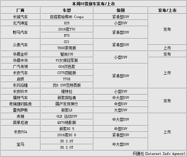 2015年7月,在乘用车市场销量继续滑落且跌幅进一步扩大的形势下,SUV市场依旧呈现高增长态势,并且成为乘用车唯一增长的细分市场,各大厂商自然会在该细分市场发力。9月4日,一年一度的成都车展如期举行,网通社对本次成都车展的新车进行了盘点,在销售形势持续火爆的SUV领域,共有22款新车正式发布或上市,覆盖小型SUV到大型SUV,值得一提的是,在这22款新车中自主品牌占据了半壁江山。