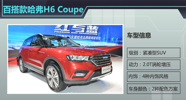 在2015成都车展上,长城汽车正式发布了百搭款哈弗H6Coupe,新车采用了全新的颜色搭配,给人带来了耳目一新的感觉。百搭款哈弗H6Coupe先期将推出两款车身配色方案,包括红黑配色和蓝白配色,除此之外,新车在外观方面与现款在售车型保持了一致。配置方面,新车将提供4种内饰风格、两种轮圈样式以及两款窗框饰条样式可选,消费者可根据个人喜好,搭配出具有自己独特个性的哈弗H6Coupe车型。动力方面,新车将继续搭载2.0T涡轮增压直喷发动机,最大输出功率为197马力(145kW),峰值扭矩315N·m,传动部分匹配6速手动或德国格特拉克6速湿式双离合自动变速器。