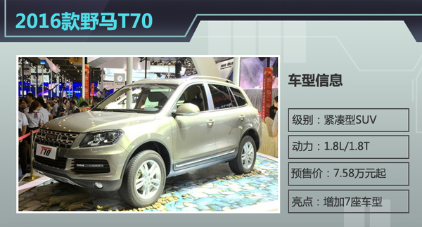 T70作为野马汽车旗下的全新战略车型,对于公司的发展起到了至关重要的作用。而在时隔半年多之后,这款紧凑型SUV即将迎来首次改款。网通社从野马汽车官方获悉,2016款野马T70正式发布,新车共有五款配置车型,预计起售价为7.58万元。新车除了配置有所升级外,还新增加了一款七座车型,从而满足更多消费者的需要。