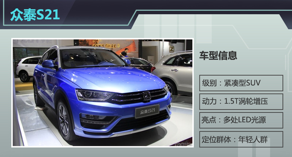 在本届成都车展上,众泰汽车发布了旗下S系列内部代号为S21的首款SUV车型,针对年轻人群设计,外形时尚,车内的大屏非常吸引眼球。众泰S21的外形轮廓借鉴了一些奥迪Q3的设计元素,前大灯内部集成了LED日间行车灯,前保险杠拥有丰富的层次。尾部设计方面,众泰S21尾灯采用LED光源,后保险杠线条厚重饱满,并采用了双边共双出的排气口装饰。动力方面,新车将会搭载1.5T涡轮增压发动机,传动部分匹配5速手动或CVT无级变速箱。