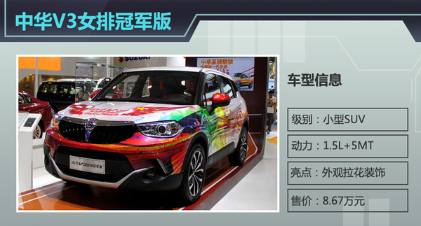 在2015成都车展上,华晨中华V3女排冠军版正式上市,新车基于中华V3 1.5L MT都市版打造,主要是在外观及内饰有部分变化,新车售价为8.67万元。外观方面,为了纪念在郎平指导下的中国女子排球队取得的优异成绩,新车在外观方面采用了色彩极为丰富的拉花装饰。细节方面,新车的后视镜采用了五星红旗图案。动力方面,该车则延续了现款车型的1.5L自然吸气发动机,其最大功率82kW,峰值扭矩145N·m。与之匹配的是5速手动变速箱。