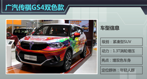 在2015成都车展上,广汽宣布传祺GS4双色款车型上市,这一特别款车顶采用黑色涂装,并提供白色和金色两种车身颜色可选。值得一提的是,特别双色款仅适用于GS4 G-DCT豪华(指导价13.68万元)和尊贵版(指导价14.68万元)两款车型选装,选装价格为2500元。新车的A/D柱及车顶部位采用黑色涂装,车身则提供白色和金色两种颜色与之搭配。从目前消息来看,传祺GS4双色车型的变化仅限于车身外观方面,外观造型方面和现款传祺GS4车型相比没有区别。