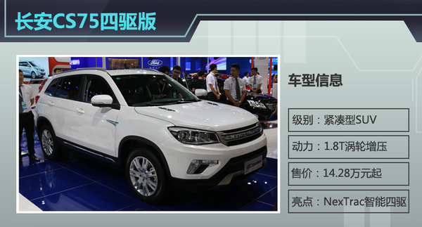 据长安汽车发布的数据显示,长安CS75车型1-7月累计售出9.81万辆,其中7月销量突破1.12万辆,同比增长111%。根据长安汽车两年推8款新车的计划,CS75将推出升级的四驱版本。在9月4日举行的成都车展,CS75全新四驱版车型正式上市。新车配备博格华纳全新NexTrac智能四驱系统,动力方面依然搭载1.8T发动机,匹配6速自动变速箱,售价14.28-16.38万元。