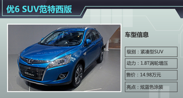 纳智捷在今年推出了新优6、新大7以及全新纳5车型后,在9月4日开幕的成都车展上,正式发布上市了优6 SUV范特西限量版,售价为14.98万元。据了解,这款限量版车型在外观和内饰方面进行很大升级,采用限量椅套、LED科技炫蓝套件等新配置,并且仅限量1000台。新车在外观方面新增了炫蓝色涂装,车内在座椅上配备了订制的“潮T椅套”,同时还新增有LED科技炫蓝套件(包括LED炫蓝气氛灯、LED排挡座饰条、LED迎宾踏板),这些新增配置让优6 SUV范特西限量版更显时尚。