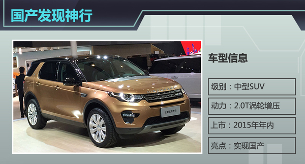 路虎第二款国产车型发现神行在成都车展正式亮相,成为继揽胜极光后的第二款路虎国产车型。该车属于发现家族,在定位上要低于路虎品牌中的卫士与揽胜家族。网通社从奇瑞捷豹路虎官方获悉:国产发现神行将于今年年底之前正式上市。国产发现神行上市后将进入中型豪华SUV细分市场,向奥迪Q5、奔驰GLK等车型发起冲击。
