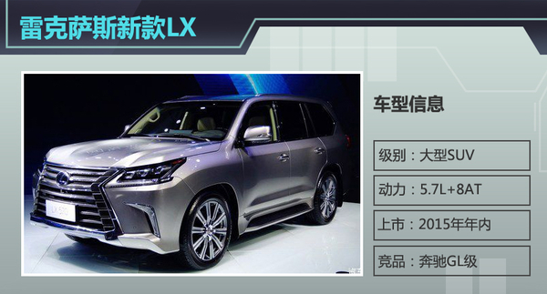 雷克萨斯LX系列自2008年进入中国以来,以其霸气外露的外观、豪华的内饰以及出色的动力性能受到消费者的青睐。自1996年推出至今,雷克萨斯LX系列共经历三次换代,如今该车将迎来中期改款车型。近日,网通社从雷克萨斯(中国)官方了解到:雷克萨斯新款LX570在成都车展中正式发布,该车对外观、内饰以及动力总成都进行了升级。现款LX570采用6速自动变速箱,而新款车型将换搭8速自动变速箱,动力大幅提升。