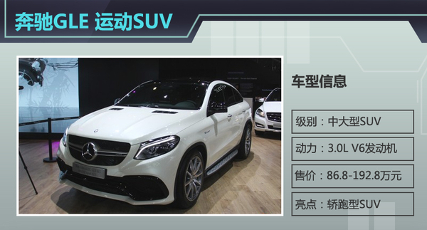 奔驰GLE运动SUV在成都正式上市,新车售价区间为86.8-192.8万元,该车为一款四门轿跑型SUV。外形设计上,其萃取了奔驰Concept Coupe SUV的设计要素。GLE 450 AMG最大功率270kW,最大扭矩520Nm。0-100km/h的时间为6秒。传动系统方面,奔驰GLE运动SUV配备的是9速9G-TRONIC自动变速箱。