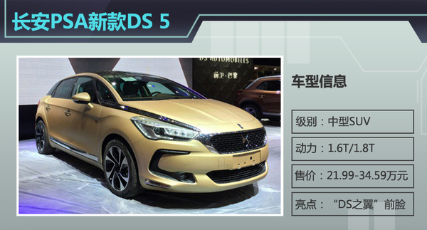 长安PSA旗下新DS 5于成都车展中正式上市,新车最大变化是采用了全新“DS之翼”家族式前脸,并推出搭载1.8THP发动机的车型。近日,网通社从DS官方获悉:新车将提供五种不同配置供消费者选择,并且新DS 5将搭载1.6THP和1.8THP两款不同排量的涡轮增压发动机,新车售价区间为21.99-34.59万元。