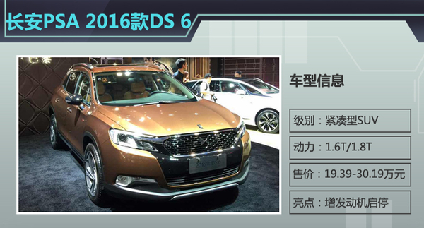 成都车展中,2016款DS 6在国内正式上市。新车最大变化是搭载了1.8THP发动机。外观和内饰方面,2016款DS 6没有变化,配置方面也基本和现款相同,最大的不同就是1.8T车型将标配启停系统,这是现款1.6T THP200车型上所不具备的。DS 6保持了DS品牌不拘一格的造型设计,但是从车头来看,虽然线条层次丰富,但综合在一起反而不显得那么个性惊艳,拥有国内多数人认可的审美情趣。