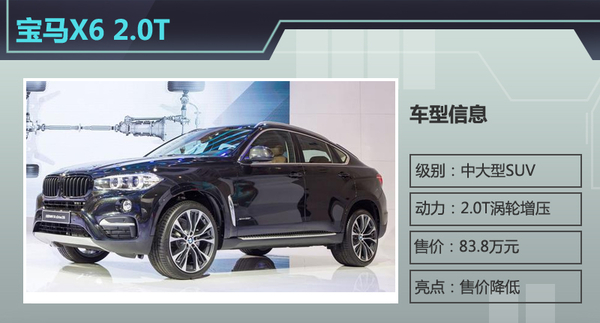 宝马旗下新款X6 2.0T车型在成都车展中正式上市,新车售价83.8万元,新车与X5 ,2.0T车型都搭载2.0T发动机和8速手自一体变速箱的动力组合。。宝马将X6定义为SAC,也就是全能轿跑车(Sport Activity Coupe)。和定位于侧重公路行驶性能的X5相比,X6在公路性能上进化的更为彻底,在外形设计和动力操控上将跑车的运动能力和SUV的多功能相融合。