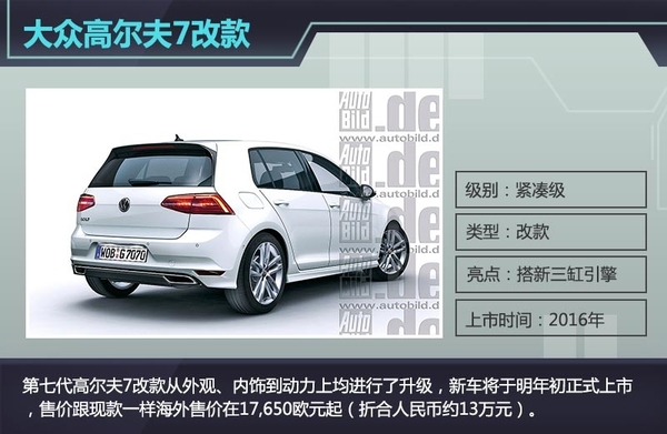 作为大众旗下一款经典紧凑级家用轿车,高尔夫自1974年诞生起就奠定了其不凡的“一生”,至今共推出了七代车型,成为全球同级别车型中销量位于前列的一款车型。日前,其迎来了第七代改款车型,网通社从德国汽车媒体Autobild获悉,第七代高尔夫7改款从外观、内饰到动力上均进行了升级,新车将于明年初正式上市,售价跟现款一样海外售价在17,650欧元起(折合人民币约13万元)。