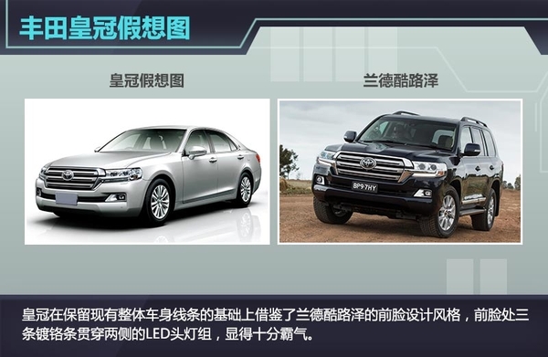 从假想图来看,皇冠在保留现有整体车身线条的基础上借鉴了兰德酷路泽的前脸设计风格,前脸处三条镀铬条贯穿两侧的LED头灯组,显得十分霸气。