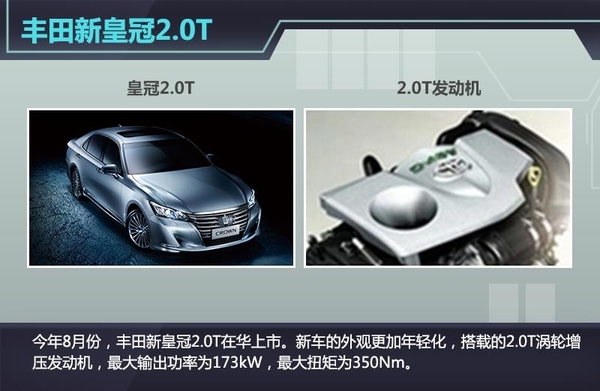 今年8月份,丰田新皇冠2.0T在华上市。新车的外观更加年轻化,搭载的2.0T涡轮增压发动机,最大输出功率为173kW,最大扭矩为350Nm,匹配8速手自一体变速箱,在动力提升的同时降低了油耗。(网通社2015年9月7日北京报道)