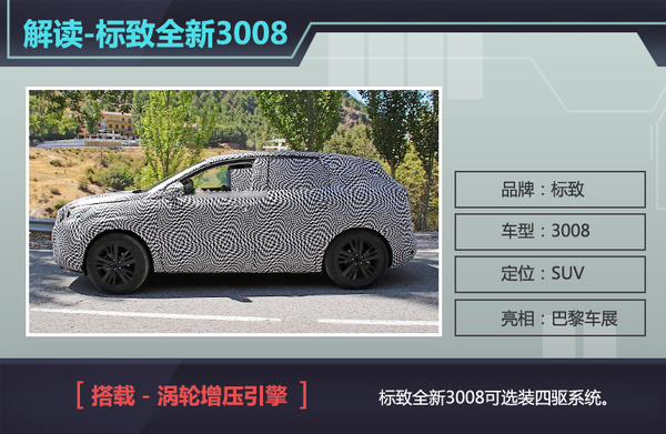 标致全新3008不仅搭载了配备涡轮增压技术的引擎,还在驱动系统中提供四驱总成的选装包,从而使这款全新城市SUV具有更强的通过性,并且提升其在高速行驶中的稳定性。与此同时,新车也将在巴黎车展期间亮相,并有望同步引入其混动版车型。