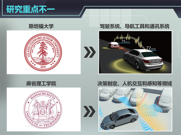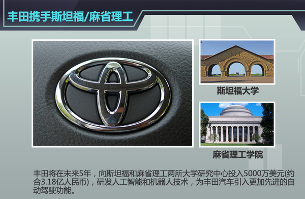 近日,丰田正式与斯坦福大学和麻省理工学院达成合作,在未来5年,丰田将向两所大学研究中心投入5000万美元(约合2.18亿元人民币),从事全自动驾驶领域的研究。网通社针对与世界顶级大学合作共同研究自动驾驶课题的车企进行了梳理:除丰田之外,奔驰、奥迪、福特也与顶尖学府在自动驾驶方面的展开合作,希望借此开发出更加智能、更为便利、更加安全且充满人性化的交通环境。