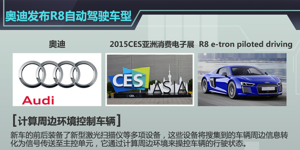 奥迪在今年上海亚洲消费电子展上首次发布了R8 e-tron piloted driving纯电动自动驾驶概念车,其实现自动驾驶的核心是奥迪与芯片巨头NVIDIA合作研发的驾驶辅助主控单元(zFAS)。新车的前后装备了新型激光扫描仪、多个视频摄像头、超声波传感器以及雷达探头,这些设备将搜集到的车辆周边信息转化为信号传送至主控单元(zFAS),通过计算周边环境来操控车辆的行驶状态。