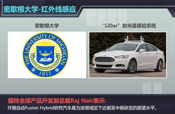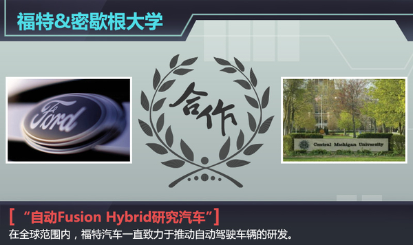 在全球范围内,福特汽车一直致力于推动自动驾驶车辆的研发,这包括目前与密歇根大学和麻省理工学院开展的合作。福特为斯坦福的工程合作项目提供一辆采用全自动驾驶技术的福特Fusion Hybrid作为实验车辆,对福特团队过去一年的研究成果进行测试。此外,密歇根大学团队基于游戏软件还开发了一个名为aDRIVE的虚拟测试系统(优化虚拟环境中的自动驾驶),借此测试车辆在动态驾驶环境下对交通信号的识别等算法,这一系统可以大大缩短验证驾驶算法用于路测的时间。