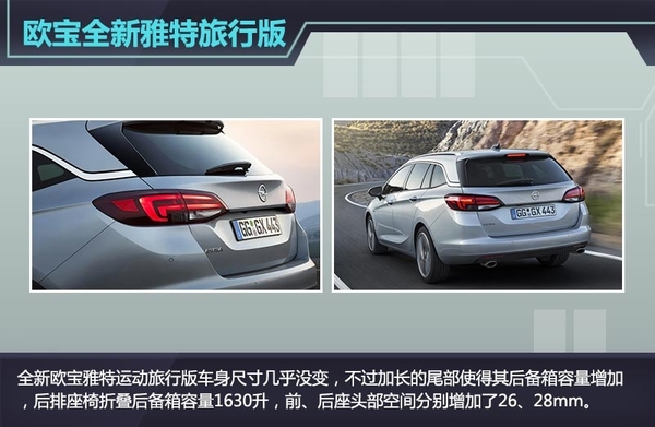 全新欧宝雅特运动旅行版车身尺寸几乎没变,不过加长的尾部使得其后备箱容量增加,后排座椅折叠后备箱容量1630升,前、后座头部空间分别增加了26、28mm。
