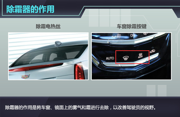 除霜器的作用是将车窗、镜面上的雾气和霜进行去除,以改善驾驶员的视野。后车窗除霜器比较常见的是采用加热丝来运行,除霜器在工作时会用到蓄电池中的电量,一般在开启十分钟左右后自动关闭。