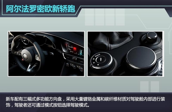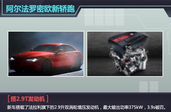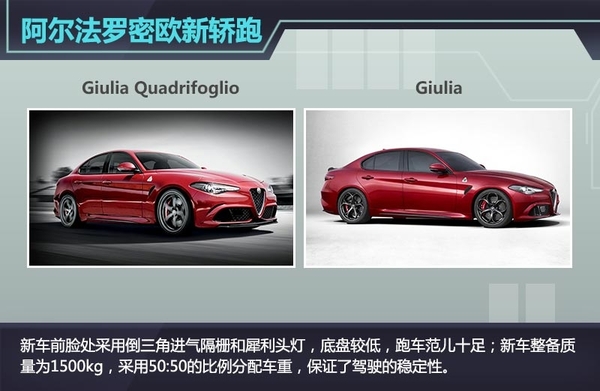 从官图来看,新车延续了阿尔法罗密欧的家族式设计风格,前脸处采用倒三角进气隔栅和犀利头灯,底盘较低,跑车范儿十足。新车整备质量为1500kg,采用50:50的比例分配车重,保证了驾驶的稳定性。