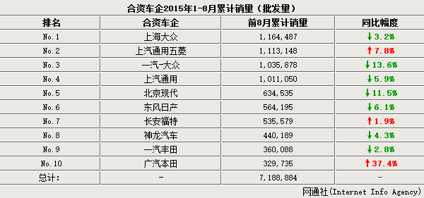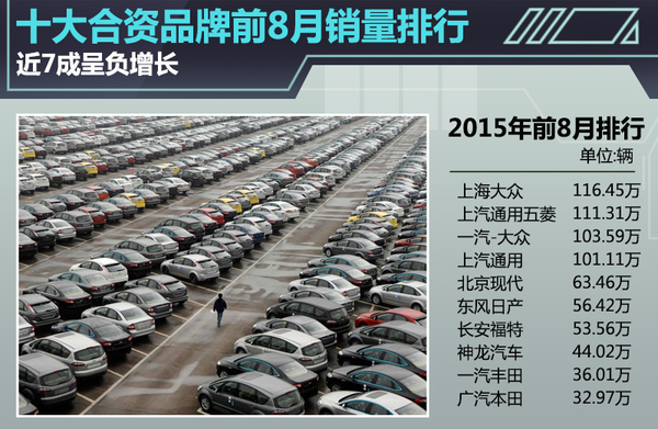 继上半年中国车市增速放缓后,国内主流合资车企业绩更是出现了负增长。网通社对上海大众、上汽通用五菱、北京现代等十家合资车企的2015年前8个月累计销量进行梳理后发现,十家合资车企销量总计同比微跌2.9%至7,188,884辆,其中近七成合资车企出现负增长。