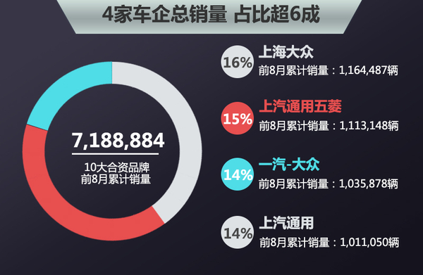 按照合资车企前8月的销量业绩排序,依次是上海大众、上汽通用五菱、一汽-大众、上汽通用、北京现代、东风日产、长安福特、神龙汽车、一汽丰田、广汽本田。其中3家美系合资品牌、3家日系合资品牌、2家德系合资品牌、1家韩系合资品牌以及1家法系合资品牌。
