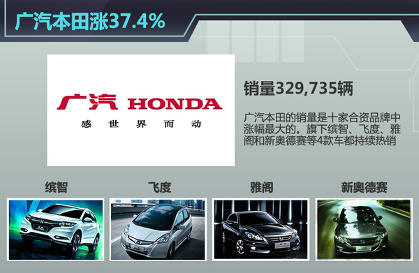 合资品牌的第二梯队中,是北京现代、东风日产、长安福特、神龙汽车、一汽丰田和广汽本田。在这之中,一汽丰田和广汽本田两个日系品牌,以及长安福特前8月的累计销量实现同比增长。其中,广汽本田的销量同比激增37.4%,是十家合资品牌中涨幅最大的。在今年前7个月累计销量统计时,广汽本田就以45.7%的涨幅继续保持着我国今年销量增速最快的合资品牌的称号。有关人士分析,广汽本田长势喜人的重要原因之一,是其旗下推出首款SUV——缤智,使得企业正式进军SUV市场。此外,飞度、雅阁和新奥德赛三款车型的持续热销,也帮助广汽本田提升了销量。
