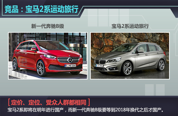 同样来自德国的奔驰和宝马,其关系有点像麦当劳和肯德基,如果一方在市场投放新产品,另外一方就会随之跟进,奔驰B级和宝马2系运动旅行车就是如此。不管是从定价、定位还是受众人群上看,二者都比较接近。而宝马2系运动旅行车已经确定明年进行国产,而奔驰B级要等到2018年换代之后才会进行国产,从这点来说奔驰有些落后。不过相信奔驰也有自己的考虑,而对B级感兴趣的消费者不妨等等看。
