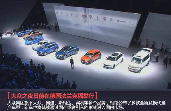 网通社德国法兰克福9月15日报道在两年一度的德国法兰克福车展开幕之前,大众集团每届车展上的重头戏“大众之夜”再一次拉开了序幕。与以往一样,此次大众之夜活动中,大众集团旗下多个品牌带来了多款重磅新车。网通社对本次大众之夜全球首发的新车进行了整理,共计8款量产新车均是首次亮相,这其中就包括颇受关注的大众全新一代途观、全新一代奥迪A4等,上述车辆在首发后,未来将陆续引入到国内市场。