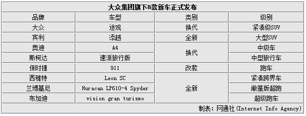 在此次大众集团发布的新车中,不乏关注度很高的车型。这其中大众品牌公布了在国内人气火热的途观的换代产品,新车在采用全新MQB平台后,不但车身尺寸全面加大,同时还衍生出7座版车型。此外,奥迪A4也推出换代车型,该车有望明年实现在华投产。与此同时,超豪华品牌宾利更是推出首款SUV—添越,该车也被视为史上最奢华的量产SUV产品。