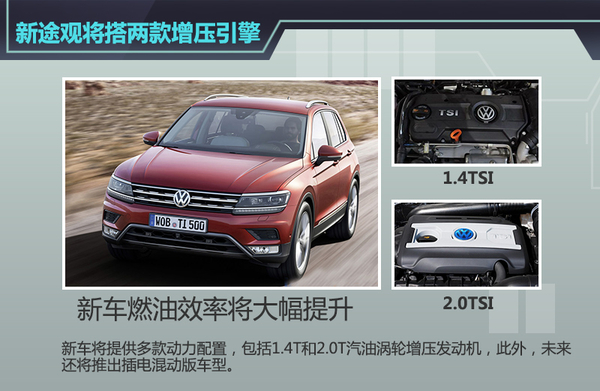 大众新一代途观采用了MQB平台打造,相比老款车型而言,新车重量降低了100斤,轴距也增加至2681mm,相比上代车型增长77mm。据官方数据显示,新一代Tiguan后排膝部空间增加29mm,同时行李厢容积也提升145升,达到615升,后排座椅放倒后可以提升至1665升。动力方面,新一代Tiguan提供多达八种动力选择,其中汽油发动机包括四种TSI发动机,最大输出功率分别为125马力、150马力、180马力和220马力。